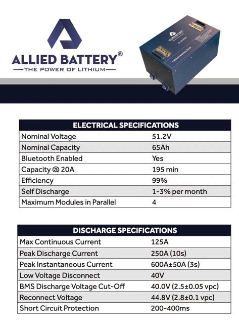 The new, high-tech, high BMS, high-quality 48V 105AH Allied lithium battery outperforms most other lithium batteries as it has high discharge capability: 180AH continuous, 350AH peak, and 600AH peak instantaneous, which is much higher than most other batteries. The 48V 105AH Allied lithium battery is also backed by an 8 year manufacturer’s warranty from the long established, American company.