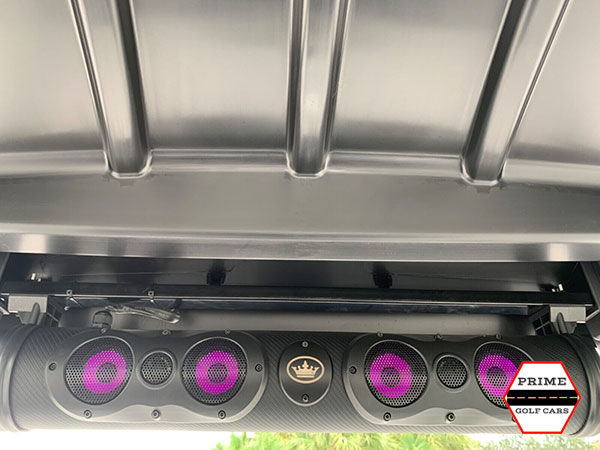While most golf carts have a 4KW motor, Aluma golf carts have a powerful 5KW 48V AC motor, and feature a 400 amp programmable Curtis controller with regenerative braking – meaning that the energy used while slowing the cart is harnessed and used to help recharge and preserve the battery level. Aluma golf carts are also unique in that they have the largest golf car cabin in their class, making the Aluma cart ideal for drivers and passengers who are tall with its wide open space for leg room. Another feature is the folding rear footrest – the footrest on the back of the cart can be folded in to make the cart shorter, creating more space for storage. The back armrests on the cart also open for small storage space, and the back seats fold down to create a flat surface for transporting materials. Underneath the back seats is also another storage compartment, with a removable cover.
